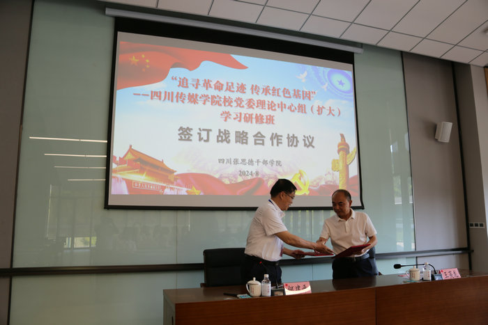 本网讯(江杰/文图)2024年8月19日,四川传媒学院党委理论中心组(扩大)学习研修班在四川张思德干部学院开班。四川传媒学院党委书记何建平、四川张思德干部学院副院长王英龙出席开班式。